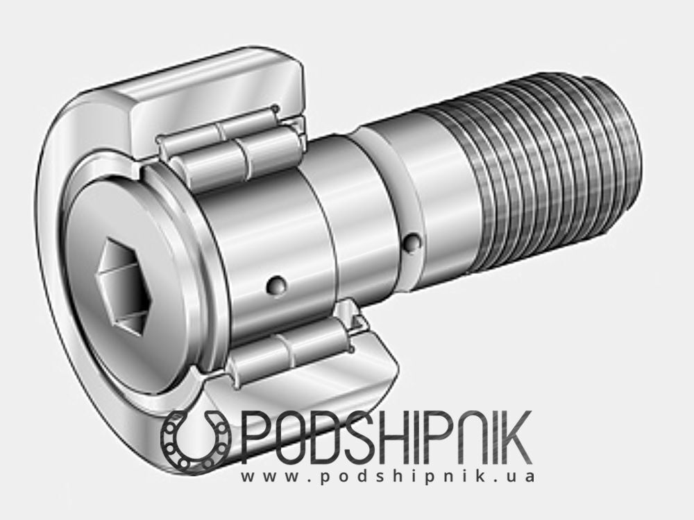 NUKR 40 A, Опорний ролик з цапфою SKF NUKR 40 A АНАЛОГИ : MCFD35 McGill Опорні ролики SKF на основі циліндричних роликопідшипників оснащуються цапфою з різьбовою частиною. Вони без сепаратора (повний набір роликів), мають концентричне посадочне місце (без ексцентриситету) і сферичний профіль робочої поверхні зовнішнього кільця. Для опорних роликів з цапфою розмір відповідає зовнішньому діаметру D. Характеристики опорних роликів з цапфою: 1) Здатні витримувати великі радіальні навантаження: товстостінне зовнішнє кільце дозволяє витримувати великі радіальні навантаження, знижуючи величину напружень від вигину і деформації; 2) Здатні витримувати осьові навантаження: фланцеві кільця дозволяють опорним роликам з цапфою витримувати осьові навантаження, що виникають внаслідок перекосу або перекидних моментів; 3) Тривалий термін служби: сферична робоча поверхня зовнішнього кільця має переваги у випадках, коли можливий перекіс зовнішнього кільця щодо направляючої поверхні, або для зменшення кромкових напруг; 4) Простота монтажу: різьбова частина цапфи опорних роликів легко і швидко дозволяє приєднати їх до відповідних деталей обладнання за допомогою шестигранної гайки.